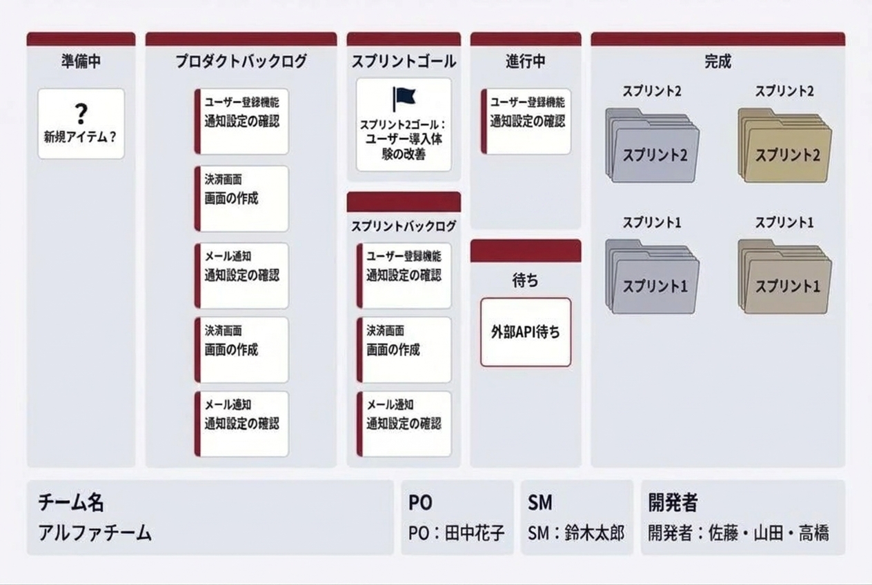 ※スクラムの全体像(役割・イベント・作成物の関係)は「スクラムとは?」記事で解説しています。本記事ではスプリントバックログに焦点を絞ります。