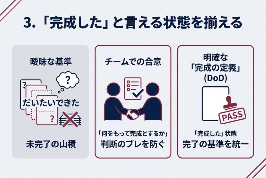 あらかじめチームで「何をもって完成とするか」を揃えておくことで、判断のブレを防ぐことができます。