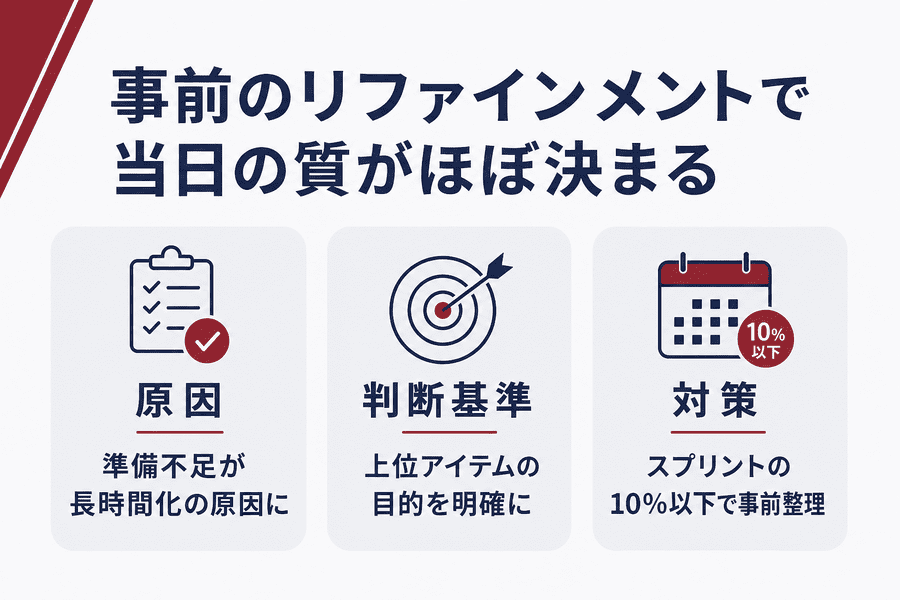 原因のほとんどは、事前のリファインメント不足です。「何をつくるか」「なぜ必要か」が整理されていないアイテムをその場で議論しようとすると、時間が伸びます。